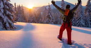 Adventurer stands with open arms in the winter mountains
